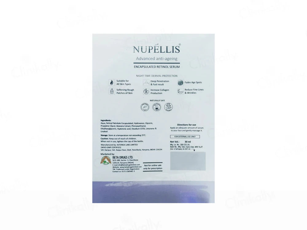 Nupellis Advanced Anti-Ageing Encapsulated Retinol Serum is designed to help reduce visible signs of ageing, including fine lines, wrinkles, and uneven texture. Its advanced formulation supports skin hydration, smoothness, and firmness while promoting a radiant, youthful-looking complexion. Suitable for daily use, this serum absorbs quickly and is ideal for all skin types.