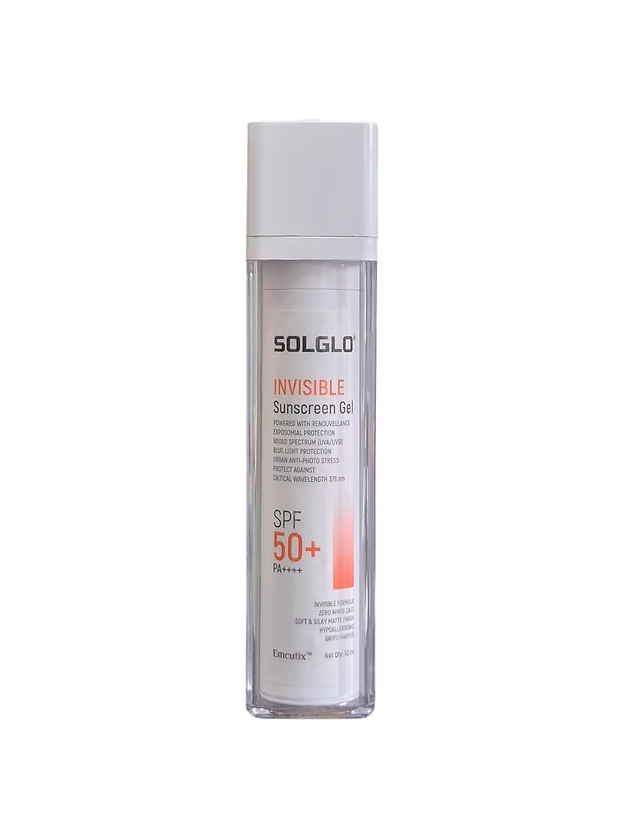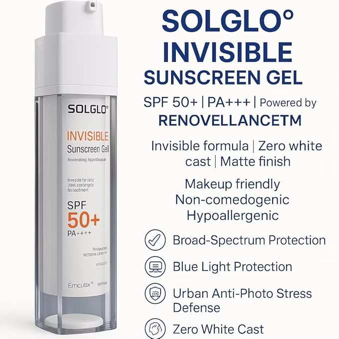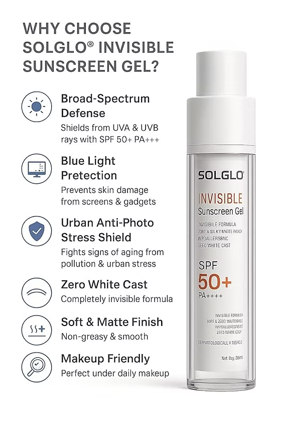 Solglo Invisible Sunscreen Gel SPF 50+ PA++++ offers high-level broad-spectrum protection against UVA and UVB rays. Its lightweight, transparent gel texture blends seamlessly into the skin without leaving a white cast, making it suitable for daily wear under makeup or on bare skin. Ideal for all skin types and for both men and women.